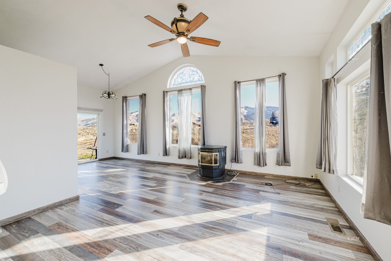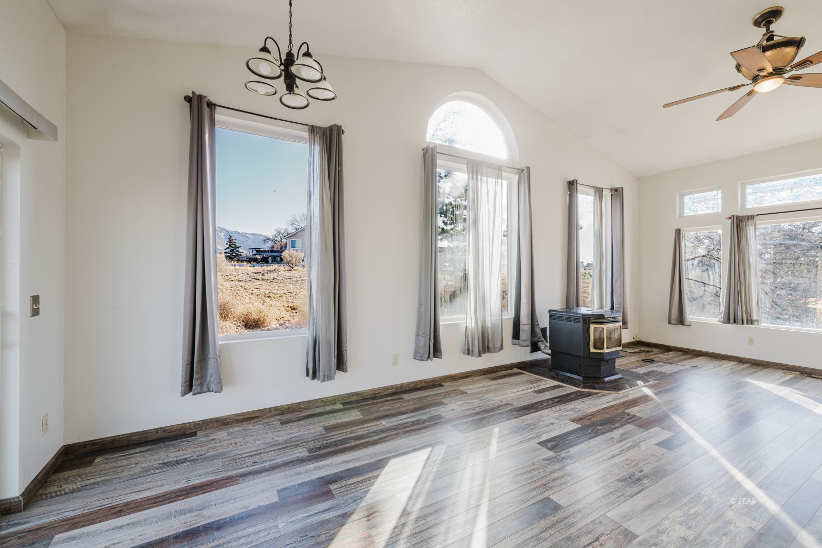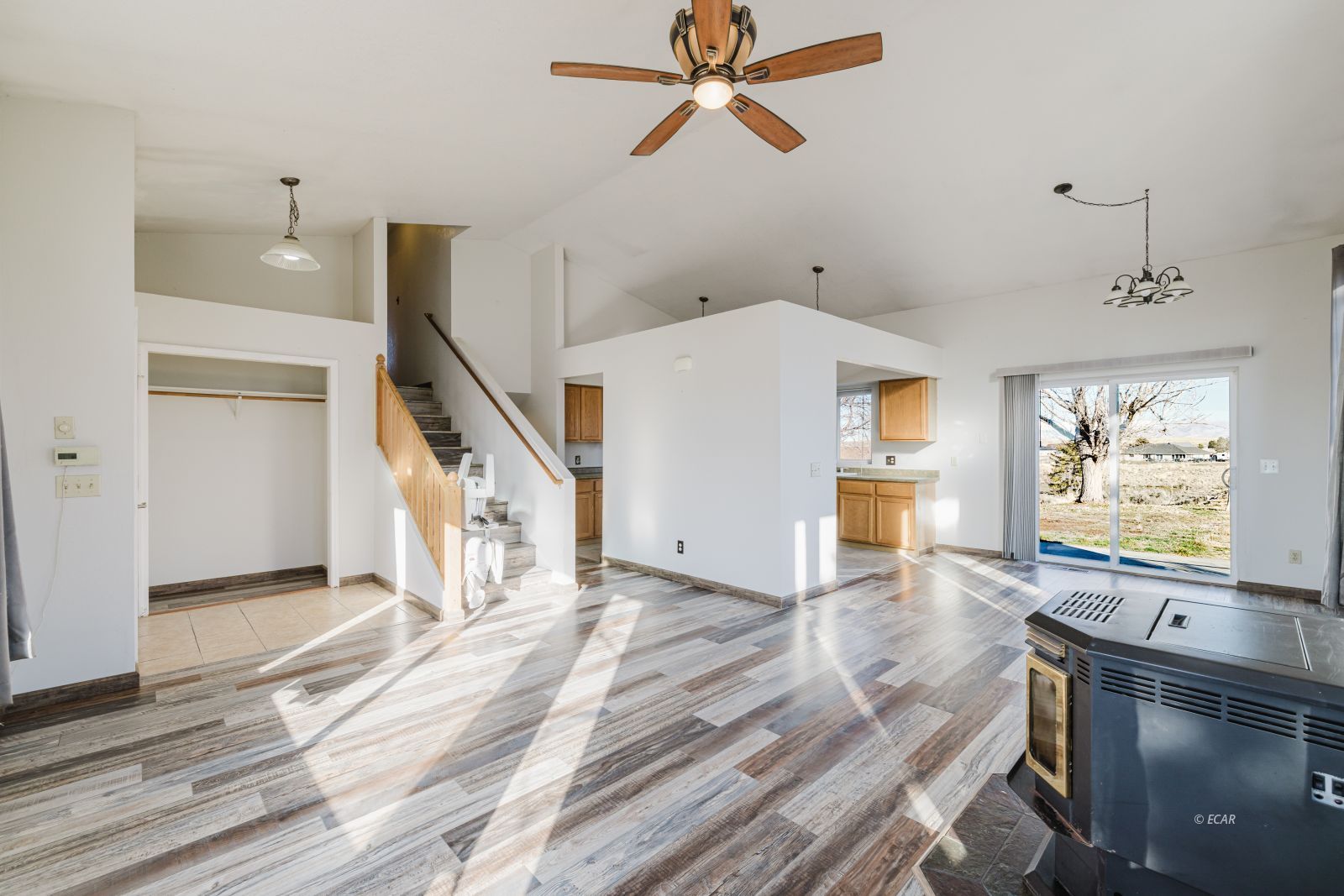 Features Flooring- Laminate, Stove- Pellet, Ceilings- Vaulted, Walk-in Closets