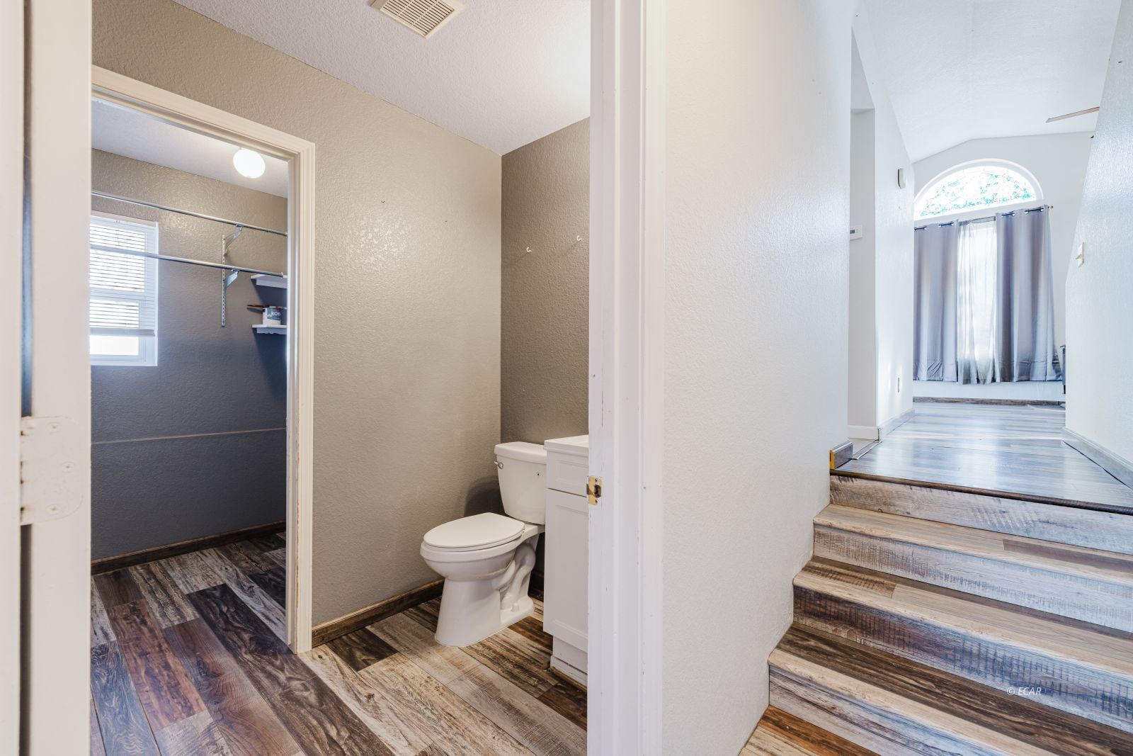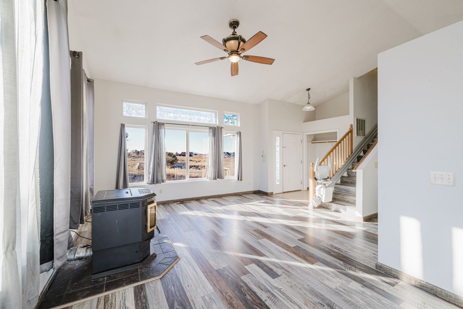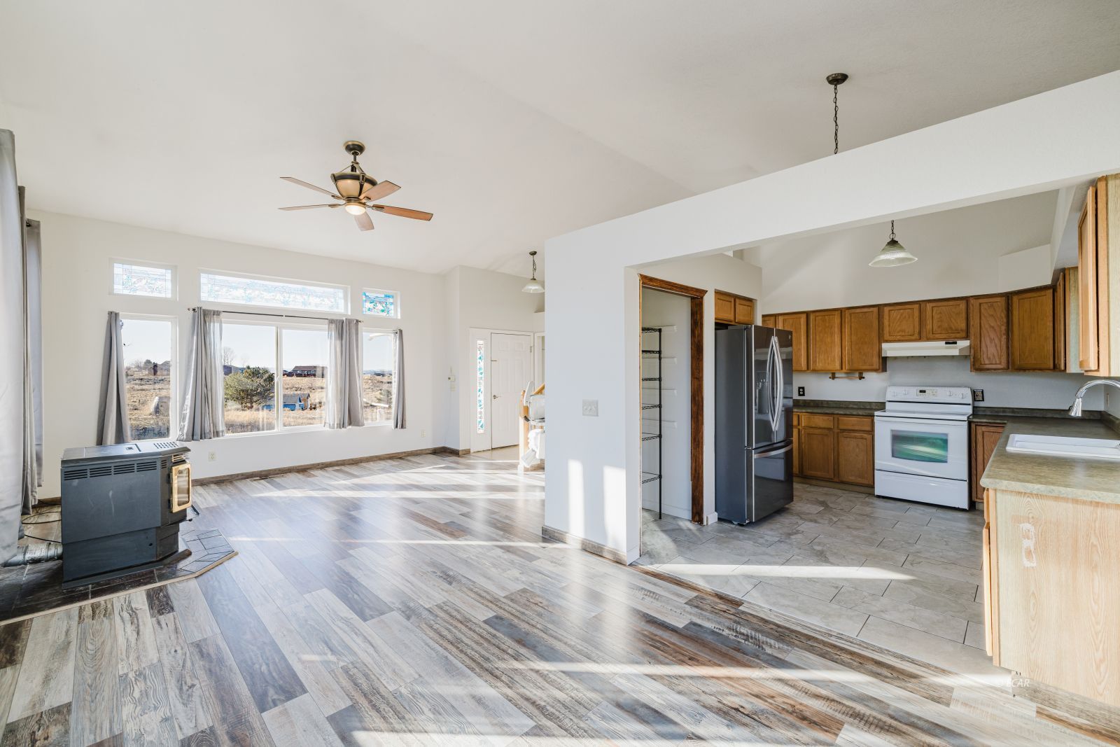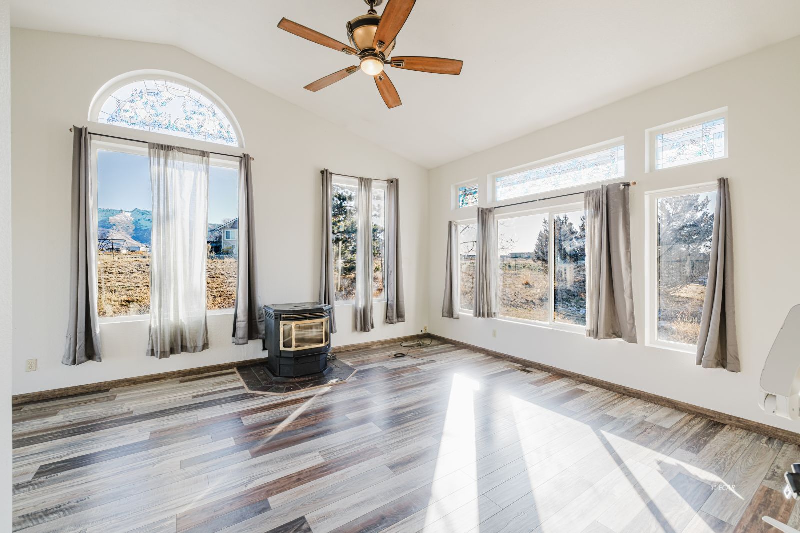 Features Flooring- Laminate, Stove- Pellet, Ceilings- Vaulted, Walk-in Closets